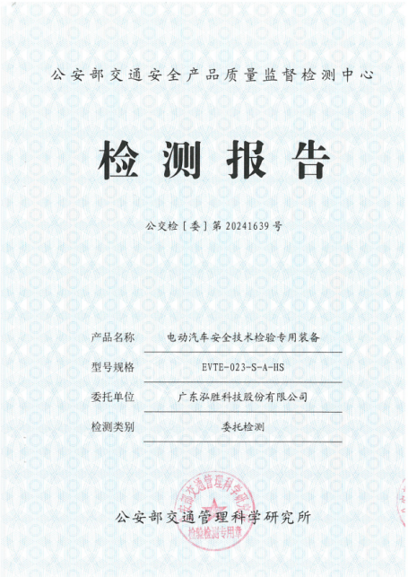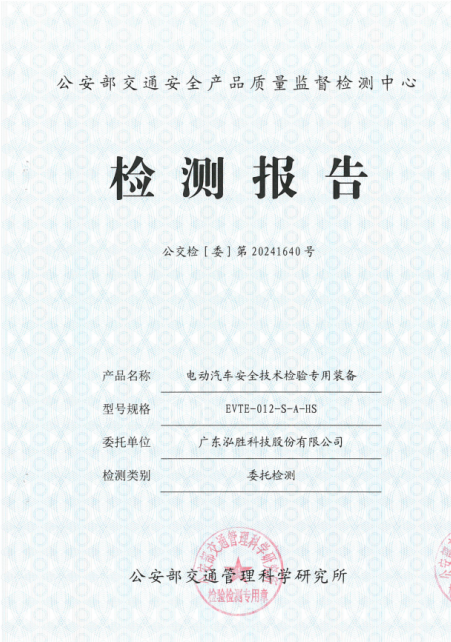 近日,泓胜自主研发的新能源汽车安全技术检验装备,凭借卓越的性能与尖端的技术,成功通过了公安部交通管理科学研究所的认证,荣获《电动汽车安全技术检验专用装备》检测认证!
