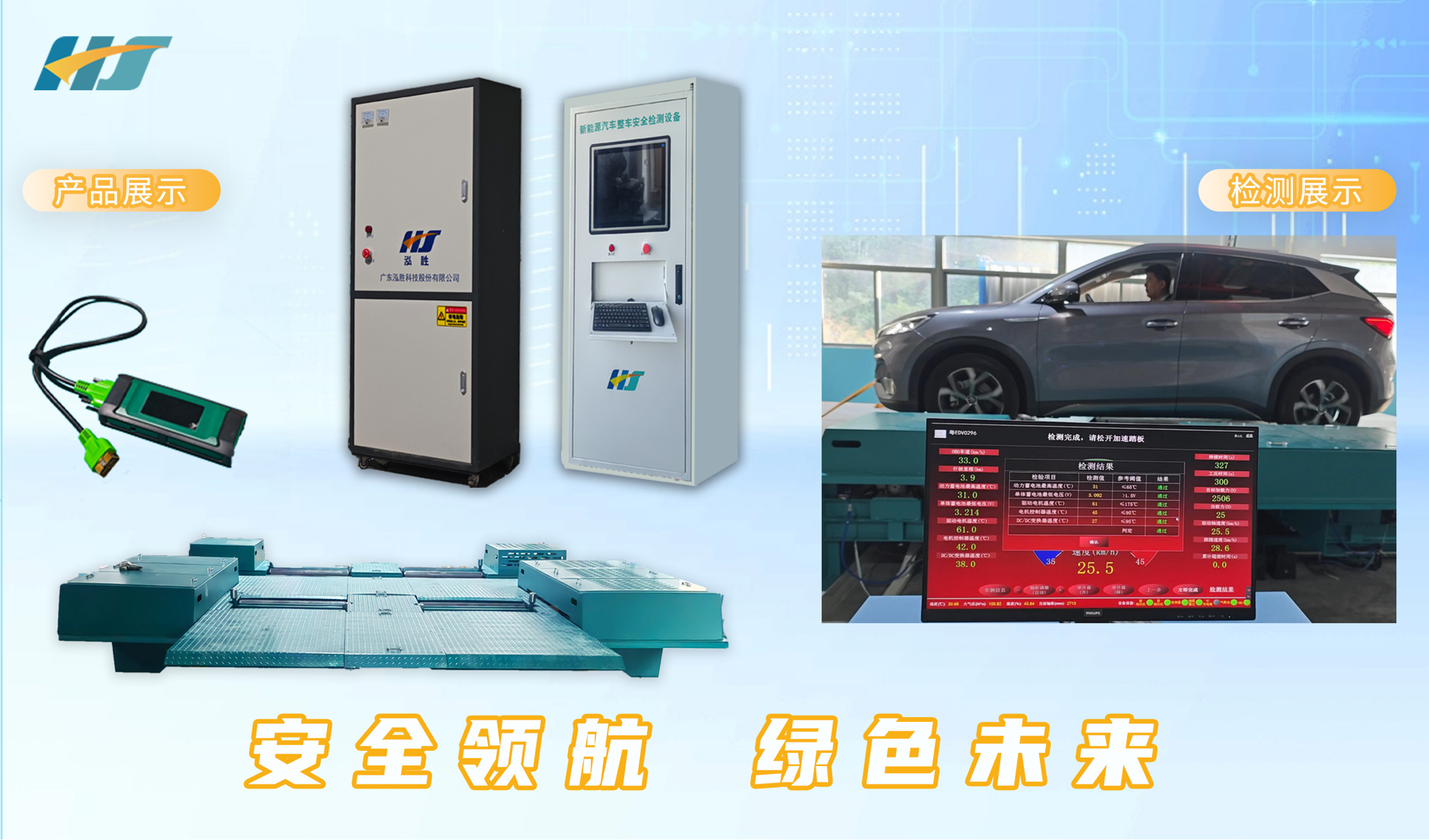 泓胜新能源检测系统主要对于新能源汽车的动力蓄电池、驱动电机、电控系统、电气安全等与运行安全相关的部件/装置技术性能进行的检验,确保车辆在充电、行驶等各个环节中的安全无忧,为每一位绿色出行者保驾护航!