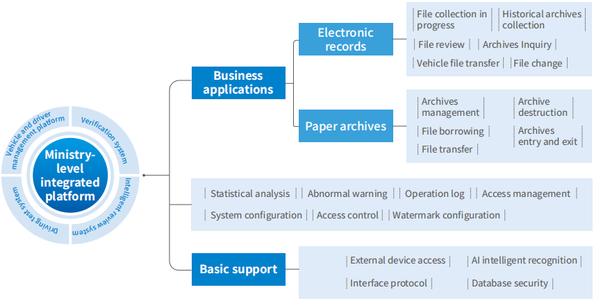 The system utilizes high-speed scanningand OCR intelligent recognition technology to digitize the entire process of driver file collection, recognition, uploading,storage, and retrieval, significantly improving the quality of original data and input efficiency.The file repository supports warehousing, retrieval, file tracking, and location,reducing reliance on manual operationslowering the risk of omissions and errors, and reducing the burden of paper files. The system can be quickly deployed,adapting to different repository sizes, and efficiently supports file retrieval, sharing, and data analysis, promotinginformation resource integration. Through electronic file management, it optimizes space utilization, saves labor costs,standardizes management processes,improves business efficiency and service levels, provides strong support for vehicdemanagement informatization, and achieves full-process,image-based, and intelligentmanagement of driver files.