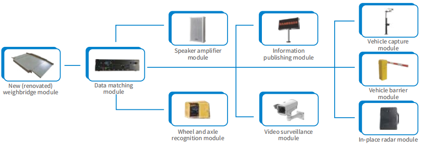 The source-level overload control information monitoring system generally consists of weighing equipment(weighbridge),wheel and axle recognition devices (including vehicle separation function), license plate recognitionintegrated machines, vehicle side-viewing integrated machines, video surveillance equipment, data acquisitionintegrated machines, and barrier gates, along with their auxiliary facilities., It primarily acquires data such as licenseplate numbers, vehicle type, number of axles, frontal images, side photos, weighing data, weight limit data, andoverload rate of freight vehicles weighed at the source enterprises.Information is then disseminated through on-sitedisplay screens and voice guidance. Data is aggregated and collected through the data acquisition integrated machineand uploaded to the backend source-level overload control monitoring system.