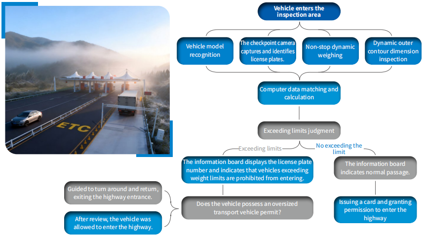 The highway intersection turn-back system mainly consists of weighing sensors, a weighing controller, a chargeamplifier, and an infrared vehicle separator. The weighing sensors primarily perform vehicle weighing,speed detection,and axle type determination; the infrared vehicle separator separates vehicles and provides start and end signals; thecharge amplifier collects charge signals and converts them into the weight required by the instrument; the weighingcontroller processes signals from various sensors, calculates data, and connects to the lane computer via a serialcommunication interface to upload the processed lane weighing information (including total weight and axle load) tothe lane computer.